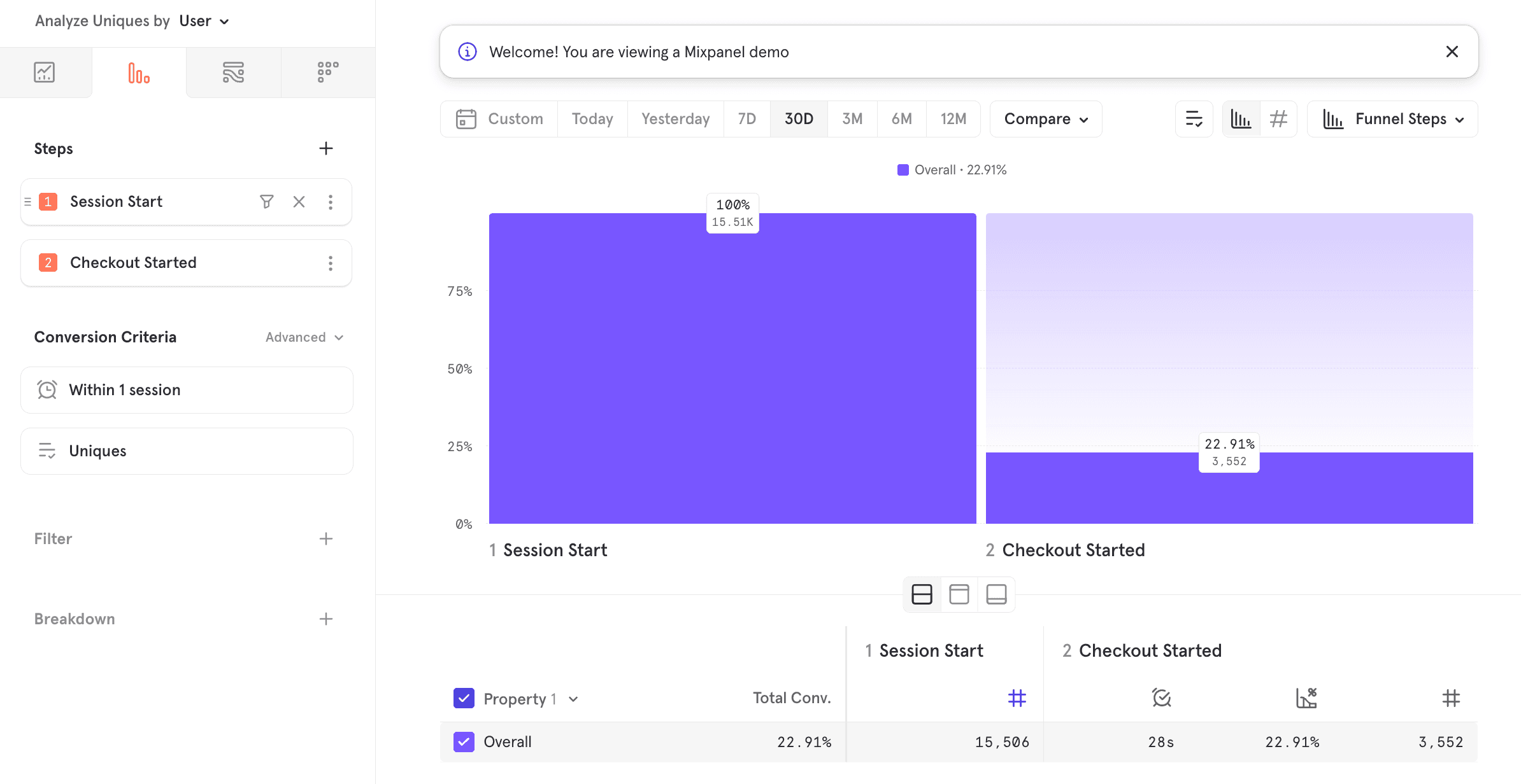 Here we see that ~22% of sessions lead to the user starting the Checkout flow. You can click any step of the funnel to dig into specific sessions that were successful or unsuccessful to understand this more.